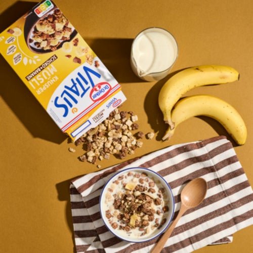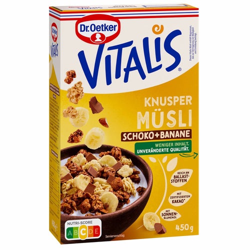 ドイツのドクターオツカー社の「Vitalis ミューズリー」は、全粒穀物、オーツ麦、ドライフルーツ、ナッツ、種子などを混ぜ合わせた、伝統的なヨーロッパの朝食用シリアル。