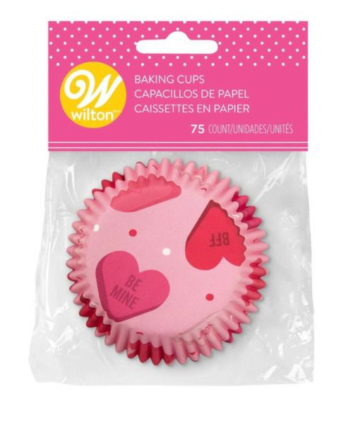 ハート柄の紙製マフィンカップ。Φ5cmのウィルトンレギュラーマフィンパンにセットし、ケーキ生地を流しこんだら、オーブンで焼くことができます。空焼きしないように注意してください。