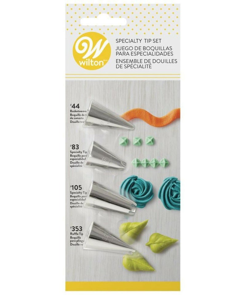 アイシングの絞り用ステンレス製口金です。 さまざまなふち飾りを絞るのに便利な基本の口金4種セット。 44番、83番、105番、353番の4種入り。 注意:電子レンジや直火でのご使用はお避けください。