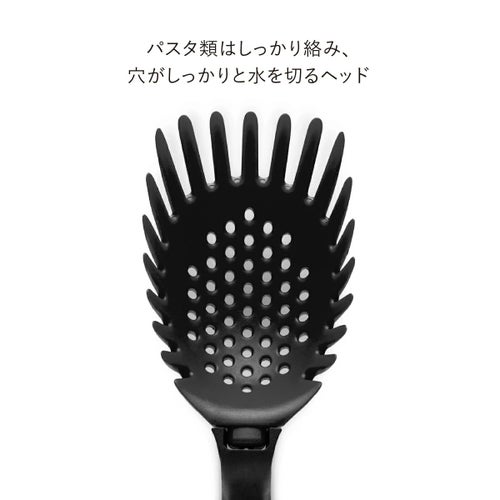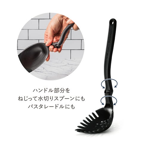 ハンドル部分をねじることで、 水切りスプーンまたはパスタレードルとして使い分けることができます。