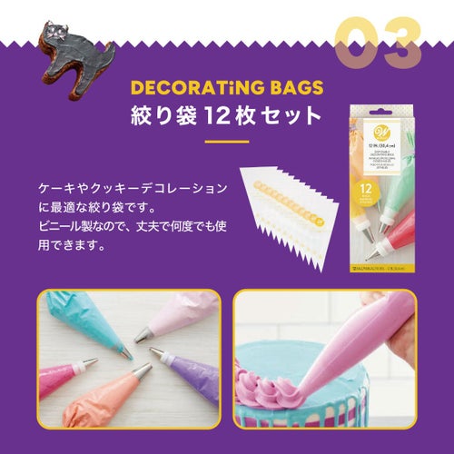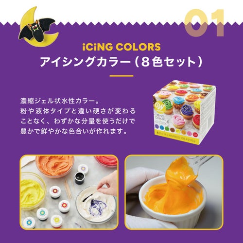 セット内のアイシングカラー(8色セット)は、コラボ動画で使用しているオレンジ・バイオレット・リーフグリーンのハロウィンカラー以外にも、レモンイエロー・ピンク・クリスマスレッド・スカイブルー・ブラウンが入っているので、様々なカラーのアイシングクッキーを作ってお楽しみいただけます!