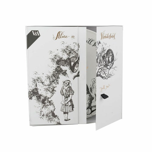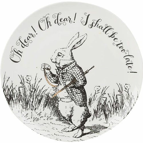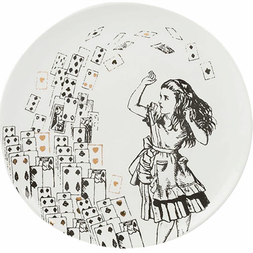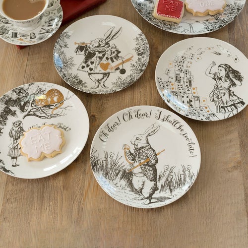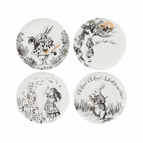 この楽しい4枚セットのサイドプレートで、ノスタルジックなワンダーランドへの旅に出かけましょう。これらのサイドプレートは、どんな食事の時間にも素晴らしいアクセントとなり、持続的な強さと美しさを兼ね備えたファインチャイナで作られています。これらは白黒のイラストでプリントされており、サー・ジョン・テニエル(1820年 - 1914年)のアートワークに基づく『アリス・イン・ワンダーランド』のカードゲームからインスパイアされています。ゴールドの装飾が美しいデザインに贅沢なタッチを加え、アイコニックな「Oh dear! Oh dear! I shall be too late!」と「Have I gone mad?」の引用が2つのプレートを飾っています。