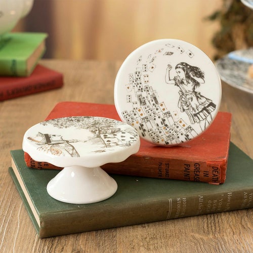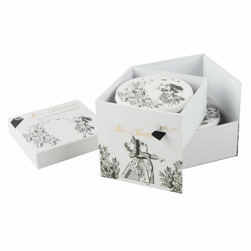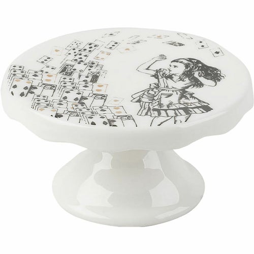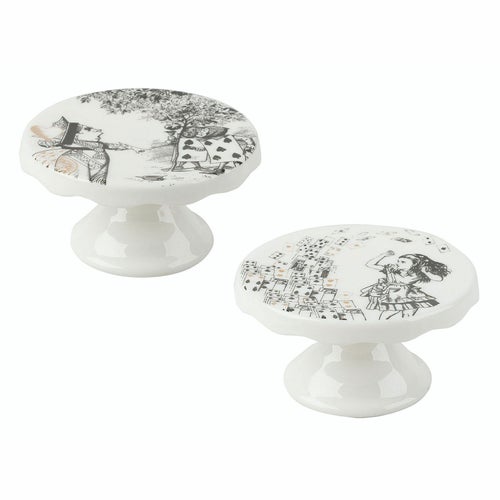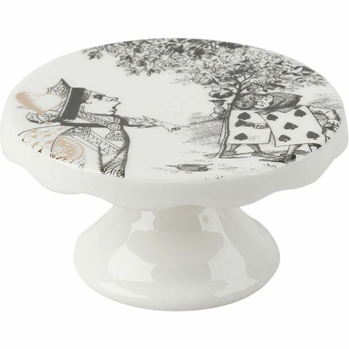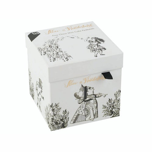 2個セットのミニケーキスタンドでワンダーランドへの郷愁の旅をお楽しみください。怒りっぽいハートの女王と、トランプの旋風の中にいるアリスが描かれています。これらの白黒のプリントは、サー・ジョン・テニエル(1820年 - 1914年)によるイラストに基づく『アリス・イン・ワンダーランド』のカードゲームに触発されており、高級なゴールドの装飾で仕上げられています。これらのミニケーキ台は、美味しいミニケーキや焼き菓子を提供するのに最適で、ギフトボックスにパッケージされており、アリス・イン・ワンダーランドの世界観たっぷりのアイテムです。