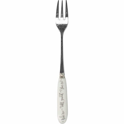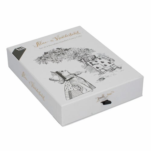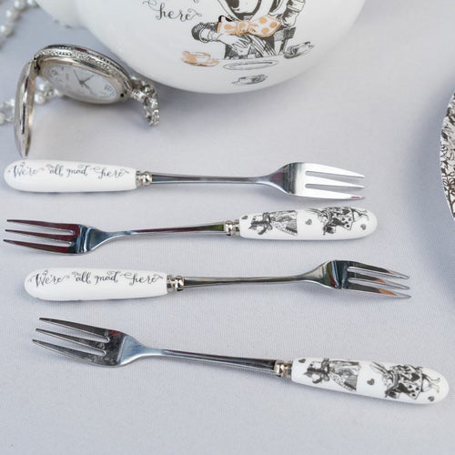 デザインは、サー・ジョン・テニエル(1820年 - 1914年)のアートワークに基づく『アリス・イン・ワンダーランド』のカードゲームからインスパイアされています。ハートの女王が悲鳴を上げている様子(「首を取り去れ!」)や、ホワイトラビットがトランペットを吹いている様子が見られます。アイコニックな引用「We’re all mad here」が裏面に美しい筆記体で印刷されています。これらの小さなフォークは、錆びにくく、腐食に強く、香りを吸収しにくく、簡単に汚れない高品質のステンレス鋼製です。ケーキや美味しいジャムタルトを食べるのにちょうど良いフォークです。
