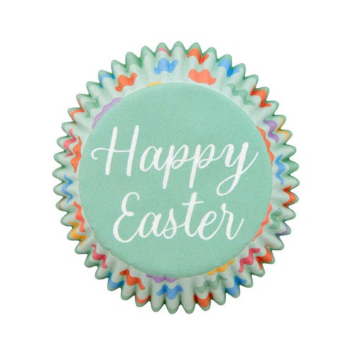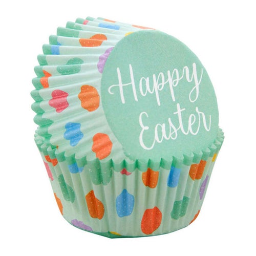 イースターモチーフのマフィンカップ。 レギュラーマフィンパンにフィットする底がφ5cmの紙カップ75枚入りです。 マフィンパンにセットし、生地を流し込んでからオーブンで焼いてください。