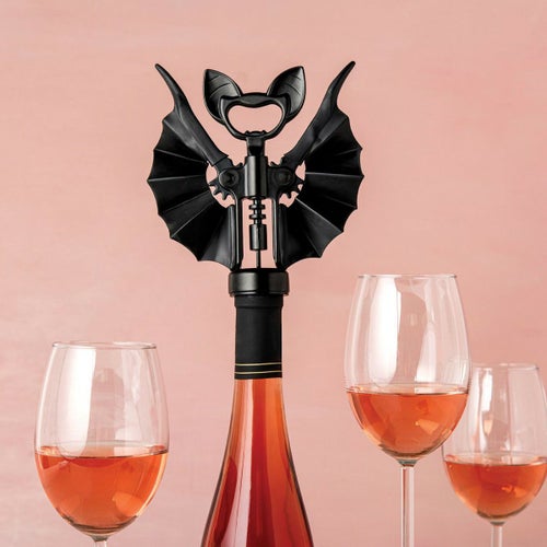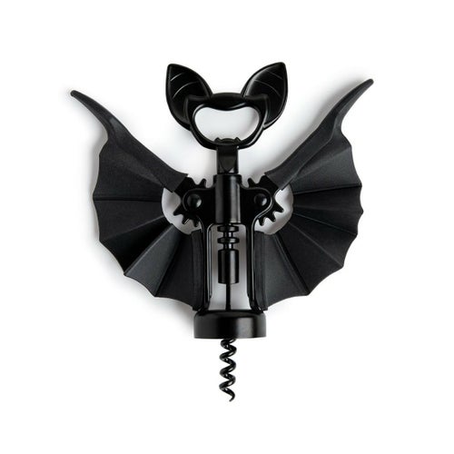ぐるぐるまわしてコルクにとまらせたら、翼を閉じるだけでコルクがポンッと上がってきます! かわいい牙がはえた口はなんと栓抜き! コルクも王冠も開けられる優秀なコウモリです。