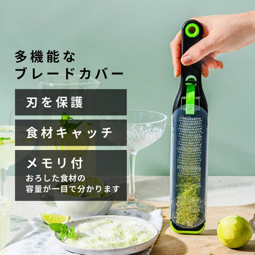 2.多機能なブレードカバー付き。付属のブレードカバーは、刃を保護するだけでなく、すりおろした食材を下に落とさずキャッチしてくれる機能もあります。メモリ付なので、グレーターでおろした食材の容量が一目で分かります!