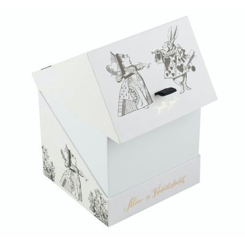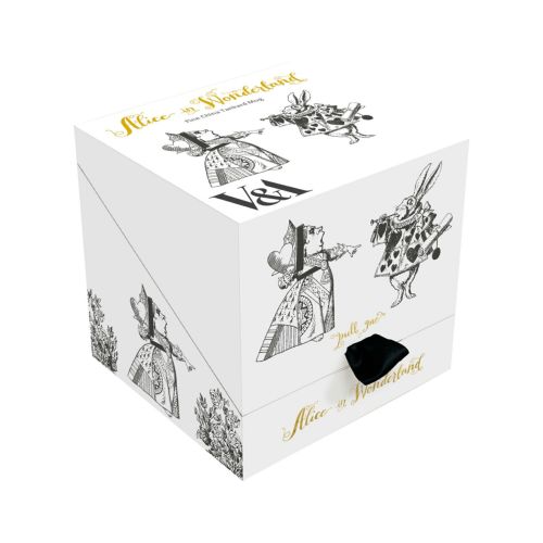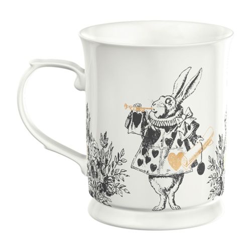 デザインは、サー・ジョン・テニエル(1820年-1914年)のイラストに基づく『アリス・イン・ワンダーランド』のカードゲームに触発されています。女王の有名なコマンド「off with their heads」は、マグの内側のリムに効果的で渦巻くフォントで印刷されています。このアリス・イン・ワンダーランドのマグをひっくり返すと、チュニックを着たまじめな白ウサギが、巻物を持ち、黄金のトランペットを吹いている様子が見つかります。