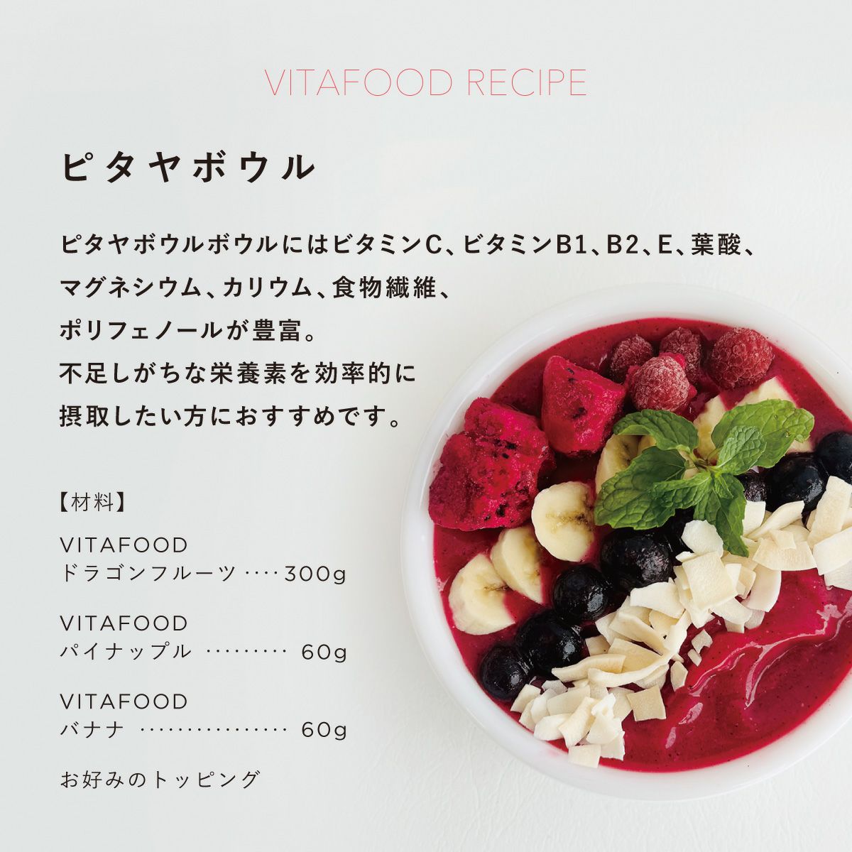 他の画像を見る 【定期配送】冷凍フルーツアソートパック ピタヤボウルセット【代引き不可】 VITAFOOD(バイタフード)/フルーツ 定期配送(月1回コース) 1回あたり ¥ 2,138 税込 在庫切れ お気に入りに登録する