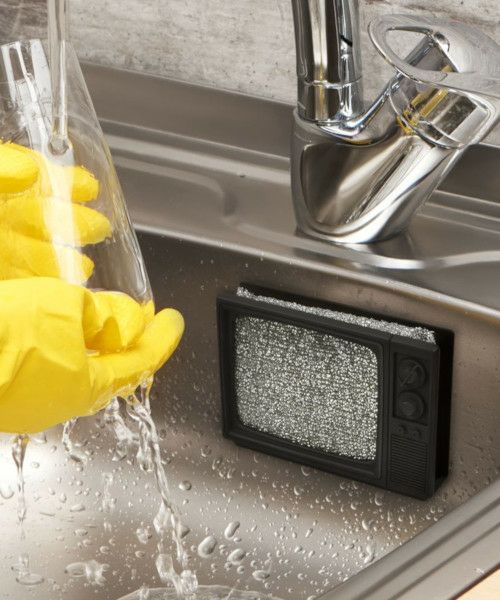 レトロな形をしたテレビのスポンジホルダー。 スポンジが放送終了後の画面みたい! 裏に吸盤が2つ付いているのでしっかりシンクにくっつきます。 スポンジは替えもいれて2つ付き。