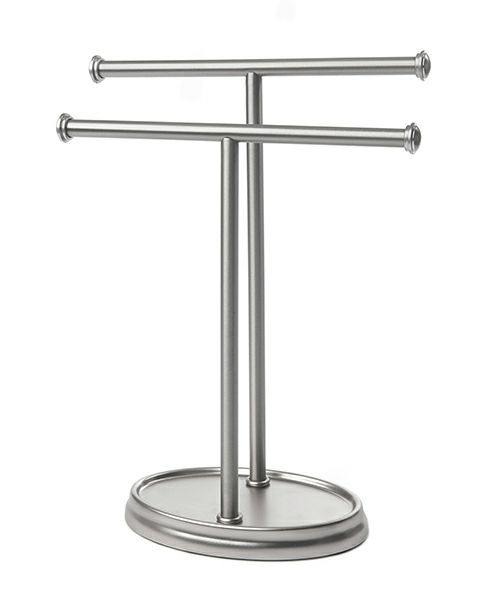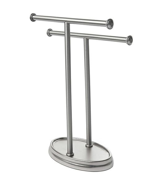 タオルツリーには、2枚のタオルを快適に掛けるスペースがあるだけでなく、小さなアイテムを収納するためのトレイとして機能する便利なベースもあります。