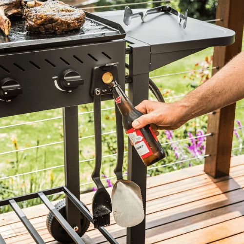 ステンレストング、BBQ トング、BBQ ブラシ、ビンオープナー、ツールホルダーが揃います。ツールホルダーには磁石が付いており、BBQ 台にツールを下げておくことができるので便利です。