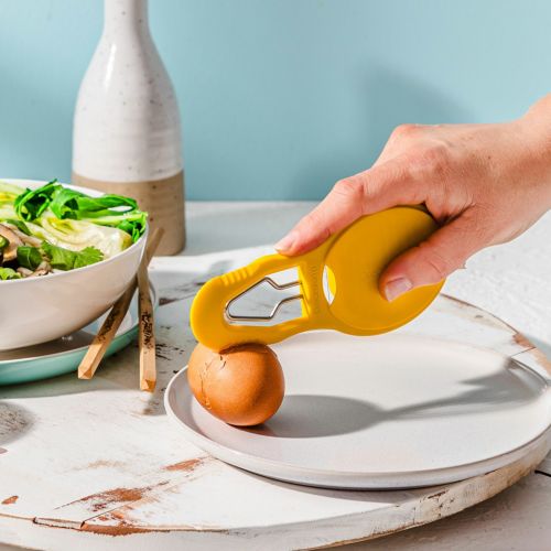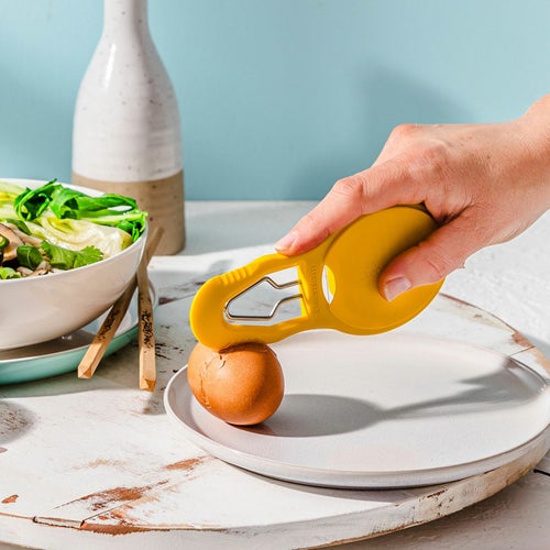①殻割器で殻を砕く!先端の黄色の突起部部で卵を優しくチョップして殻を砕きましょう。