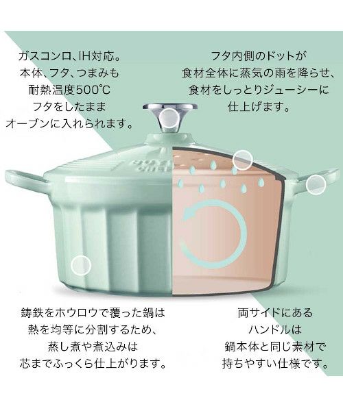 また、ぴったりとフィットするふたが食材の水分を閉じ込め、ふた内側の隆起したドットが食材全体に雨を降らす効果を生み、料理をジューシーに、しっとりと風味豊かに仕上げます。