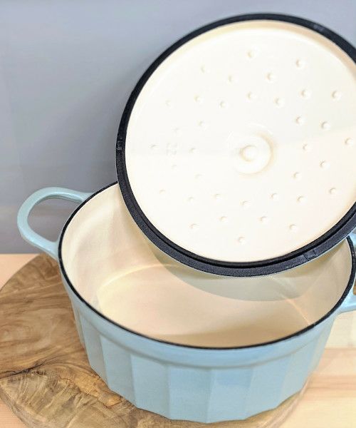 美しさと機能性が1つになったデザイン。鋳鉄をホウロウでコーティングした鍋は熱を均等に分割し、蒸し煮や煮込みは芯までふっくら仕上がります。