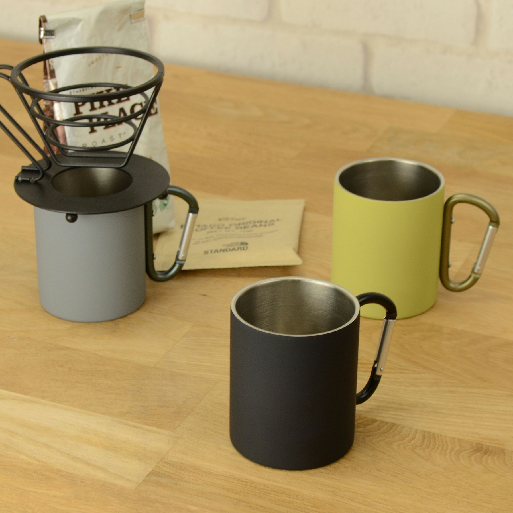 取っ手がカラビナ付きだから、持ち運びしやすい。 350mlの缶がすっぽりはまります。 冷えている飲み物が温まりにくくもなります。 容量:約300ml 【サイズ】 W11xD7.5xH9cm 【本体重量】 115g 【素材】 (本体)ステンレススチール (カラビナ)アルミニウム 【原産国】 中国