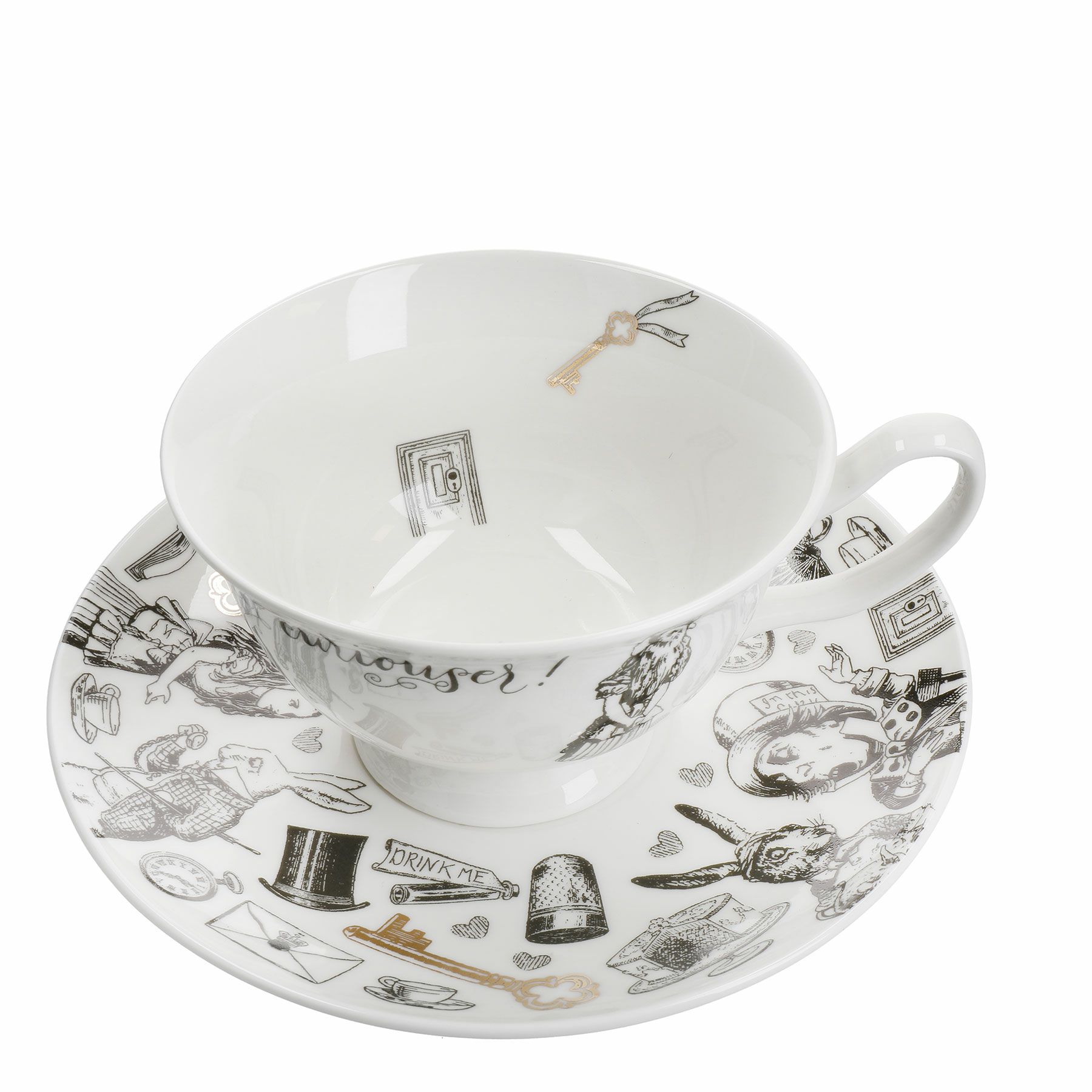 デザインは、サー・ジョン・テニエル(1820年 - 1914年)のアートワークに基づく『アリス・イン・ワンダーランド』のカードゲームからインスパイアされています。ゴールドの装飾が美しいデザインに贅沢なタッチを加え、アイコニックな「curiouser and curiouser(ますます不思議になる)」の引用がティーカップを飾っています。ソーサーの中央には、「we’re all mad here(ここではみんな気が狂っている)」という文言があり、カップから一口飲むまで見えないようになっています。
