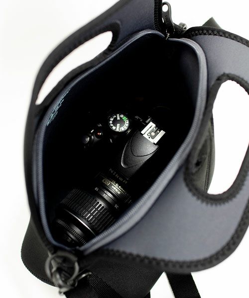 ウェットスーツなどに使用されているクロロプレンゴム素材で作られた、ショルダー付きトートバッグ。