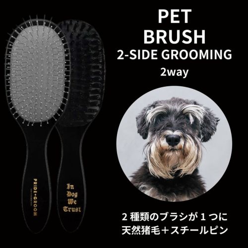 2wayで使える万能ブラシ♪ イノシシ毛でツヤ出し、スチールピンで被毛のもつれをほぐします。 【使い方】 ①スチールピン側のブラシで被毛の絡まりをほぐします。 ②猪毛のブラシで毛をなめらかにし、天然オイルで被毛を保湿します。