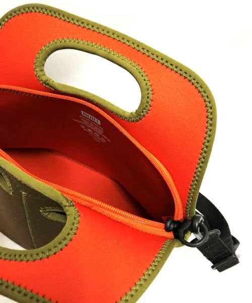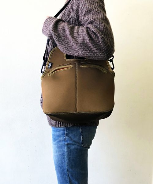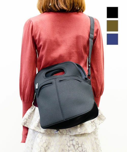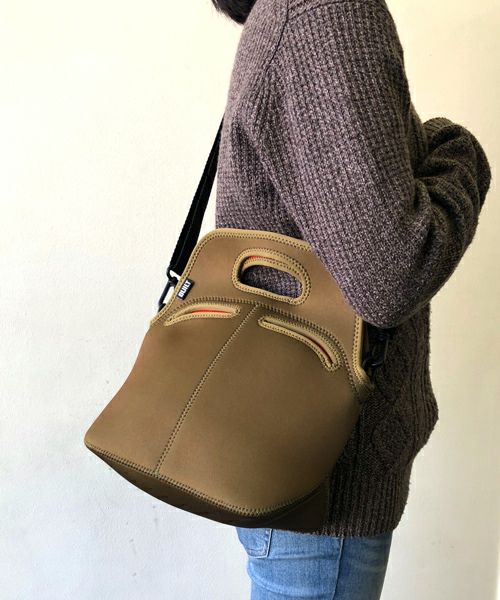 ウェットスーツなどに使用されているクロロプレンゴム素材で作られた、ショルダー付きトートバッグ。