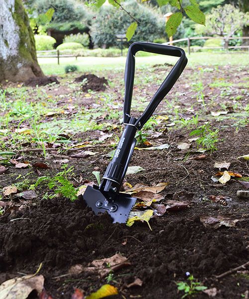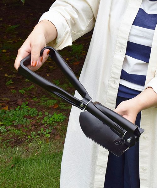 コンパクトに三つ折りで畳めて持ち運べるシャベル。 ネジを緩めて、つるはし用にも変えることができます。 バッグ付きなので、車載用にもおすすめです。 キャンプ、雪かき、家庭菜園、ガーデニング、防災用品などに。