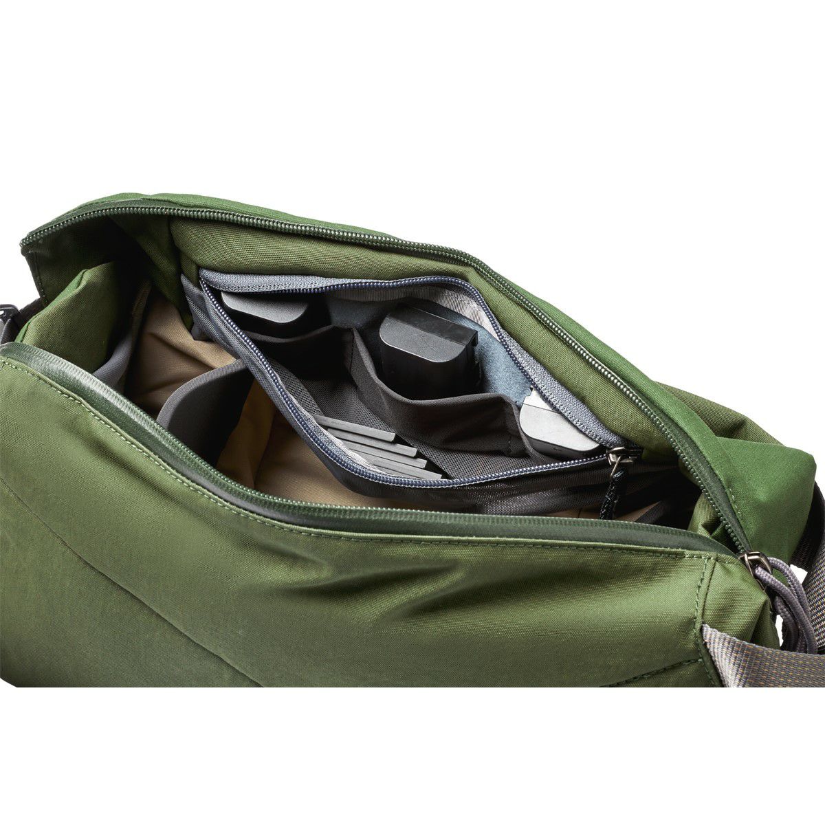 ●柔らかな裏地を配したファスナー付きメッシュポケットにバッテリー3つが収まる専用スペース