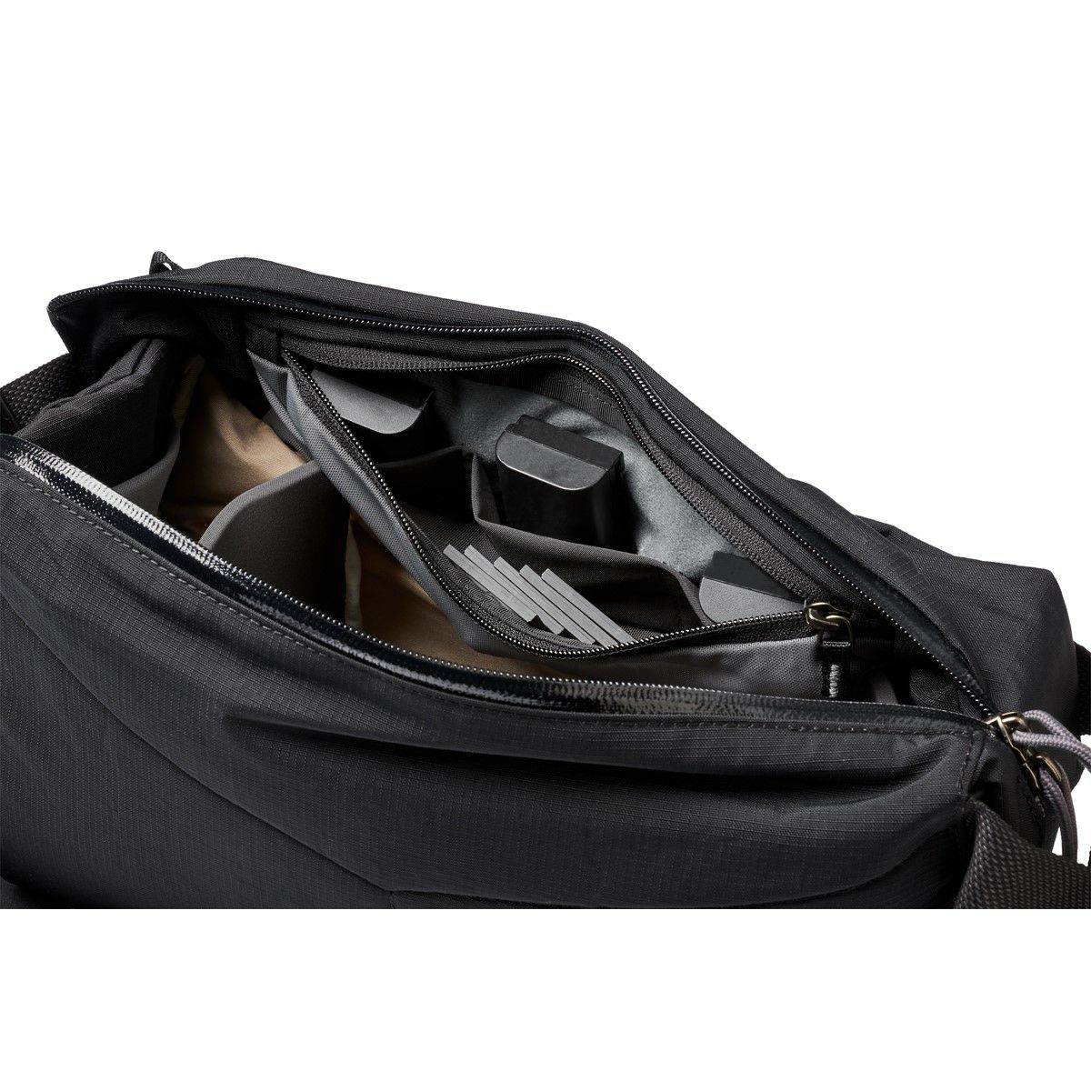 ●柔らかな裏地を配したファスナー付きメッシュポケットにバッテリー3つが収まる専用スペース