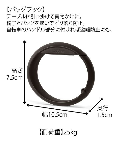 テーブルに引っ掛けて荷物かけ、椅子とバッグを繋いでずり落ち防止、自転車のハンドル部分に付ければ盗難防止としても役立つバックフックです。 ※設置の厚さ:3.5cmまでに対応しています。 ※耐荷重25kg