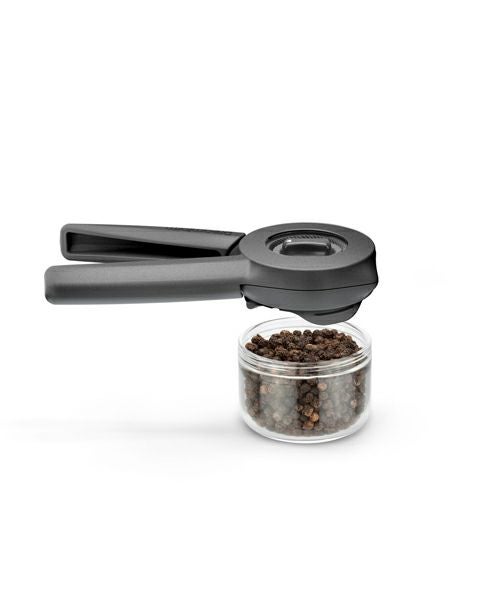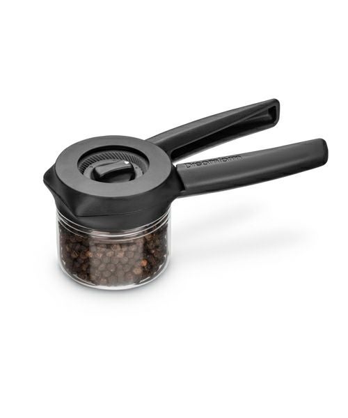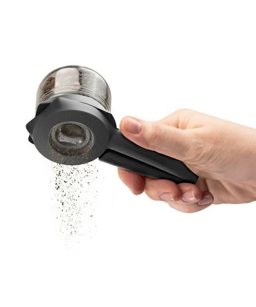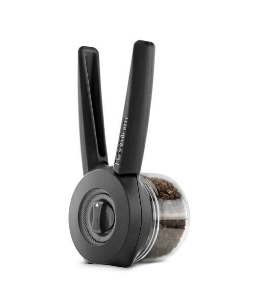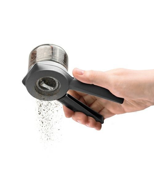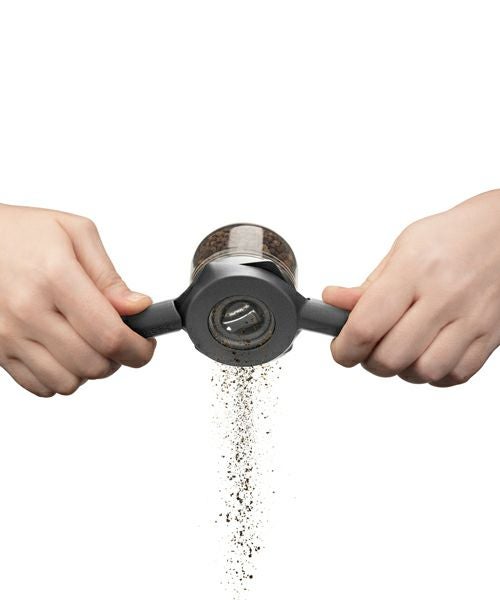 片手でも、両手でも挽けるスパイスミル。 中央の黒いダイヤルで粗さを調節できます。 長いレバーが特徴的で、片手でも簡単に使用することができます。 粒の大きさは3段階のダイヤルで変更することができるので、これ一つでコショウ・塩・その他の様々なスパイスにお使いいただけます。 アウトドアシーンにもおすすめです。