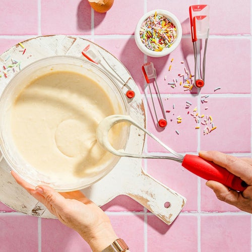 ③フラット型:クリームやソースをかき集めたり、省スペースで収納可能丸みのある持ち手が手の形にしっかりフィットしてくれるので、疲れにくくスムーズに泡立てができます。