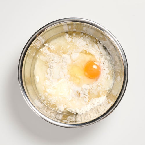 材料を滑らかになるまで混ぜます。スプリンクルをトッピング用に大さじ1杯取り分け、残りを生地に合わせてさっくり混ぜます。