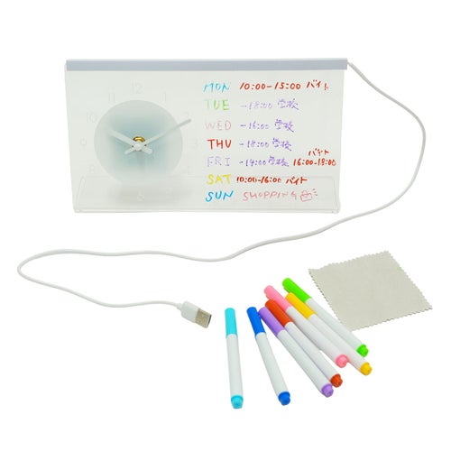 透明なアクリルボードとLEDライトを融合させた、新感覚のクロック。日々のタスクや大切な人へのメッセージを書き込めば、底面からの柔らかな光が文字をドラマチックに浮かび上がらせます。
