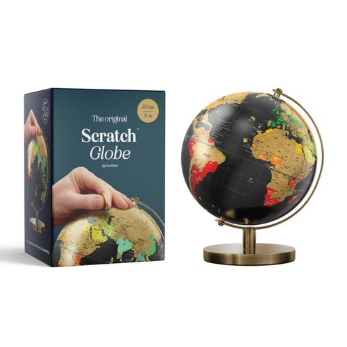 スクラッチつきの地球儀は、飾るだけではなく、行った国を削って記録できるすぐれもの♪