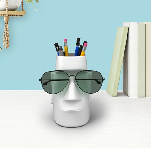 モアイがデザインされたユニークなペンスタンド。 筆記具を立てて置くのはもちろん、コスメのツールスタンドや、カトラリースタンド、メガネスタンドとしても活躍します。 特徴的な大きな鼻はメガネホルダーとしてお使いいただけます。