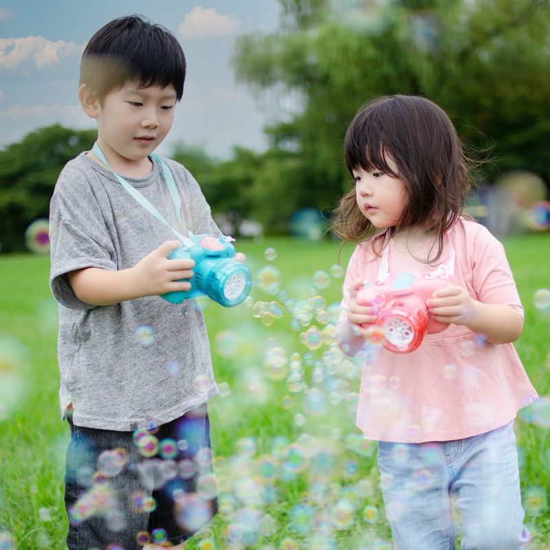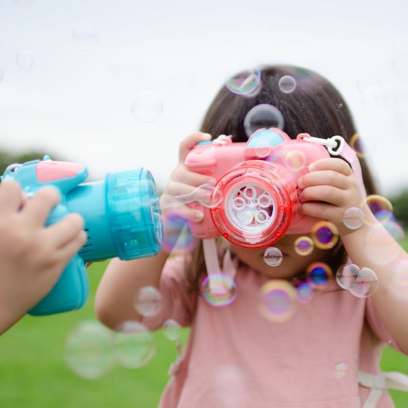 *カメラではありません! 光る! カメラ型のシャボン玉マシーン! シャッターボタンをポチッと押すと、シャボン玉がたくさん飛び出します。 大量バブルで、気分はマーメイド!? まさにバブルシャワー♪ レジャーやイベントの盛り上げアイテムとしてもおすすめ。 便利なネックストラップ付! 希釈タイプのシャボン玉液付き! 【仕様】 単三電池3本使用 *別売り 【対象年齢】 6才以上 【付属品】 ネックストラップ×1、シャボン液×2、ボトル×1
