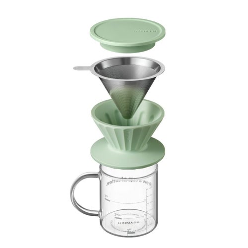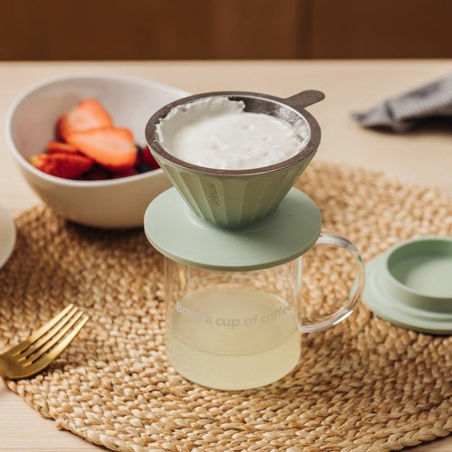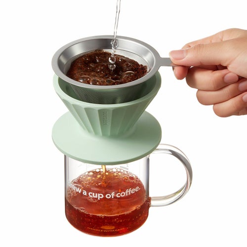 再利用可能なステンレスフィルターとガラスカップがセットになったコーヒードリッパーセット。