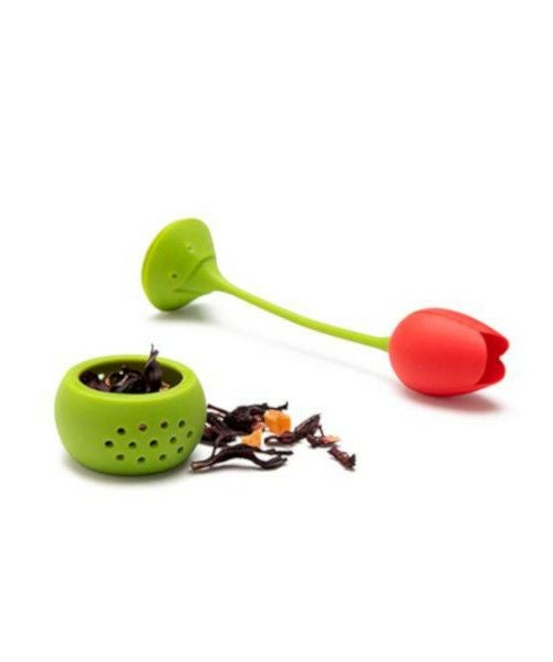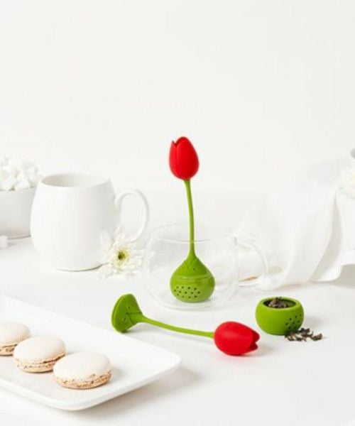 カップからひょっこり顔を出すチューリップ。球根部分に茶葉を入れるだけで簡単に煮出すことが出来ます。ホットだけでなく、アイスティーを作るのにもおススメです。
