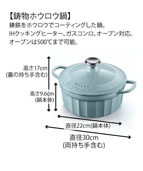 - Φ22cm×H9.6cm(鍋本体)、Φ30cm(両持ち手含む)×17cm(鍋蓋含む)