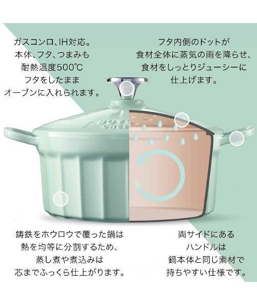 また、ぴったりとフィットするふたが食材の水分を閉じ込め、ふた内側の隆起したドットが食材全体に雨を降らす効果を生み、料理をジューシーに、しっとりと風味豊かに仕上げます。