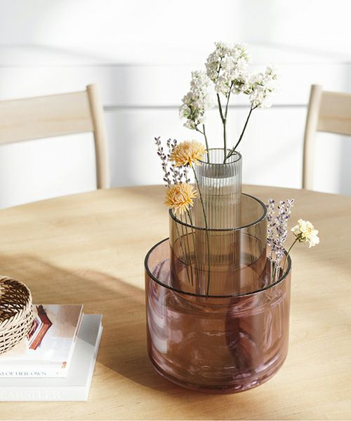 3つのサイズの花瓶を組み合わせて使う3点セットのフラワーベースです。 単品として使用することはもちろん、組み合わせることでよりテーブルの上を華やかにすることが出来ます。 すべてのベースはガラス製で、透き通った色が特徴です。 花瓶としてだけでなく、キャンドルホルダーや小物入れと様々な場所でお使い頂けます。 それぞれ高さの違うスモール、ミディアム、ラージの3サイズに分かれています。
