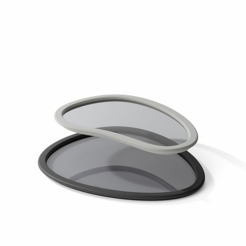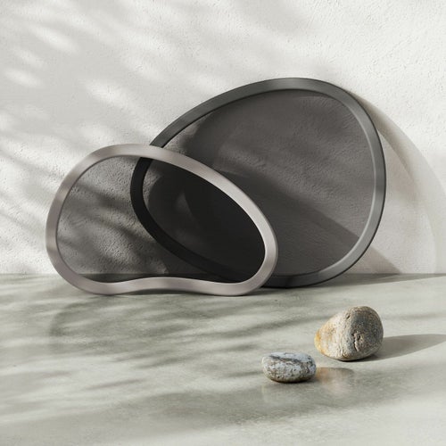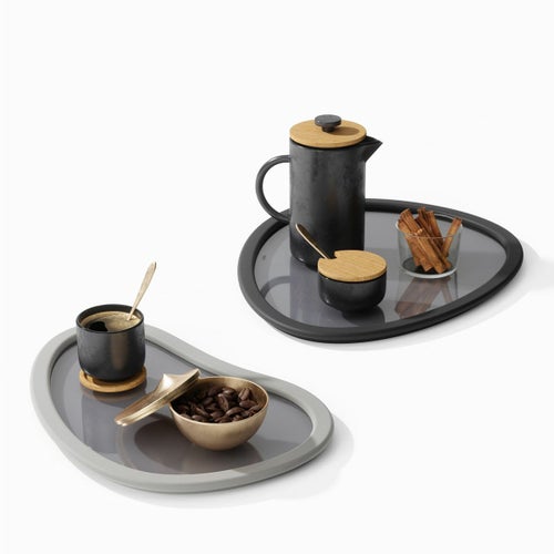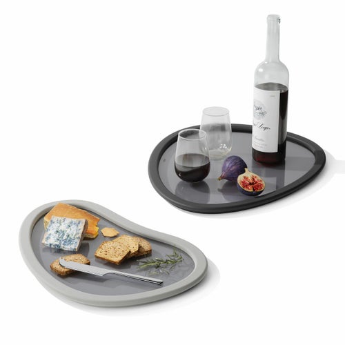 トレイ2つのセットは、ユニークな有機的形状のゴム製の縁と着色されたガラス仕上げが特徴です。