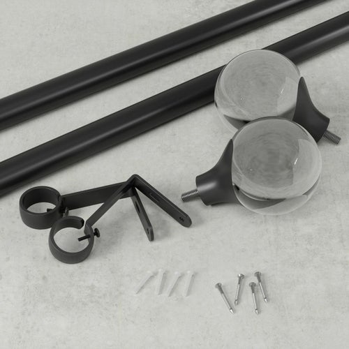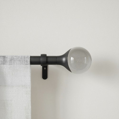 完全なモダンカーテンロッドセット:オーバは、目を引く外観のスモーク仕上げを備えた、ユニークな地球儀のようなフィニアルを備えています。