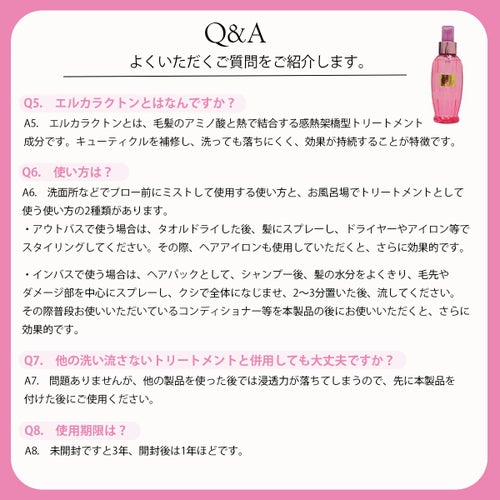 シャンプー後、髪の水分をよくきり毛先やダメージ部を中心にスプレーし、クシで全体になじませて2~3分おいてください。