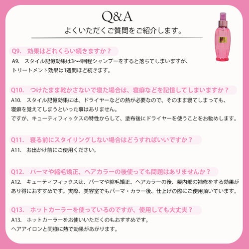 その後、軽く流してください。キューティFIXをスプレー後、いつもお使いのコンディショナーをお使いいただいても効果的です。