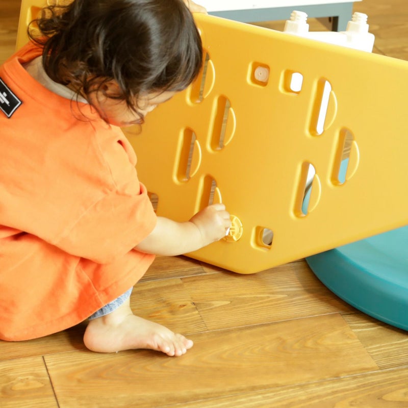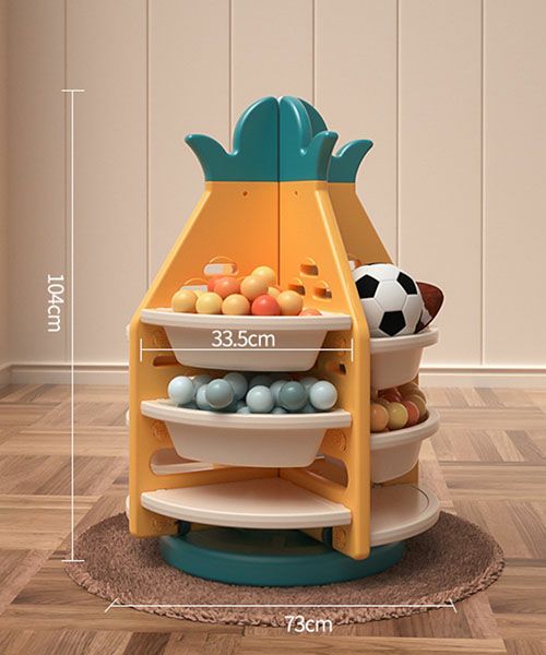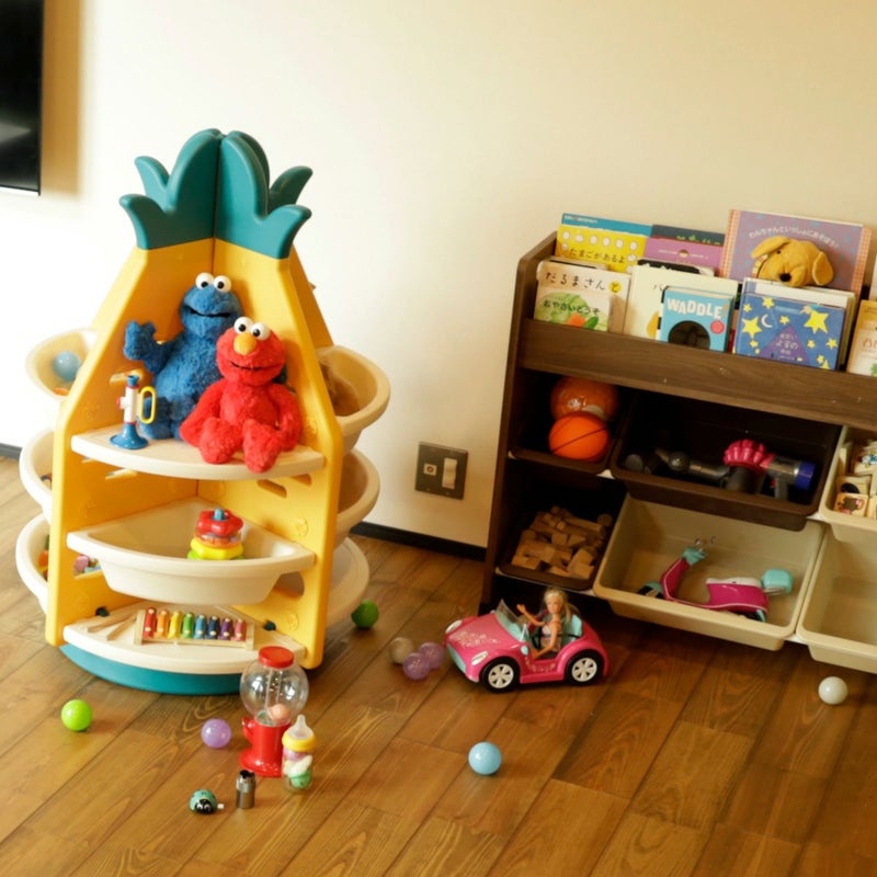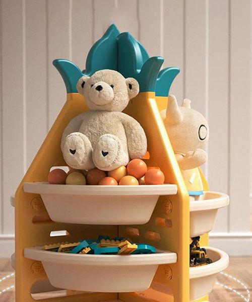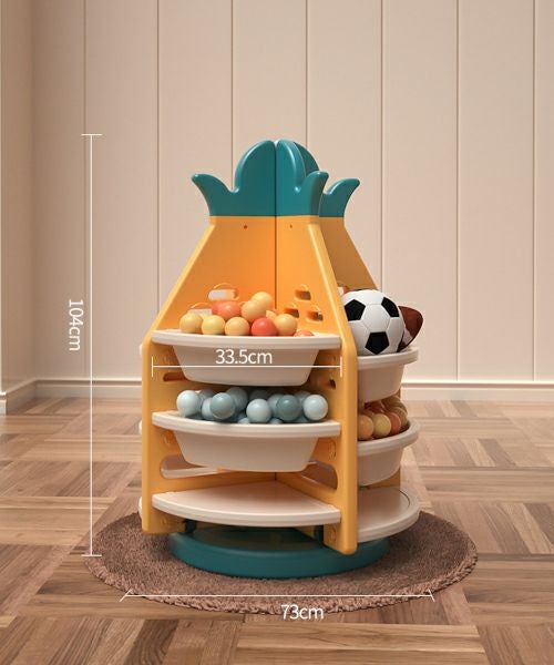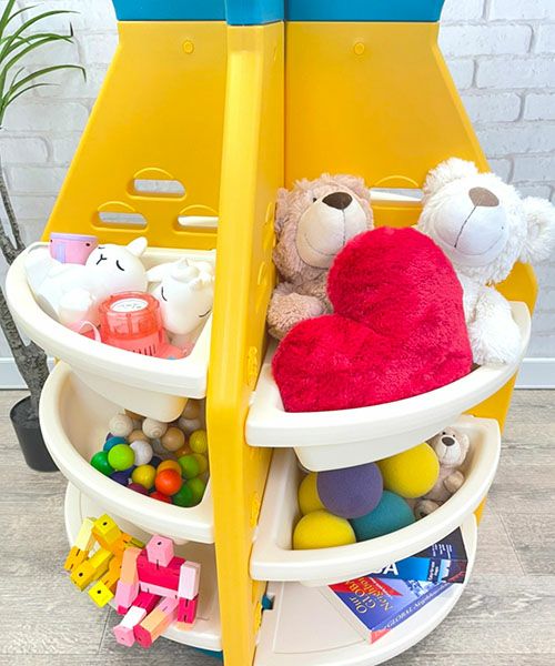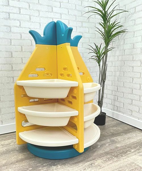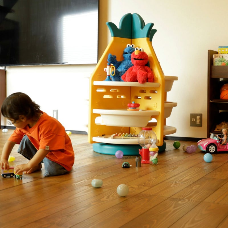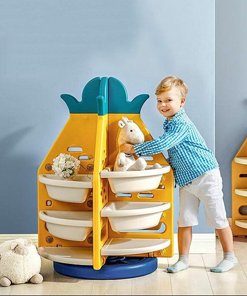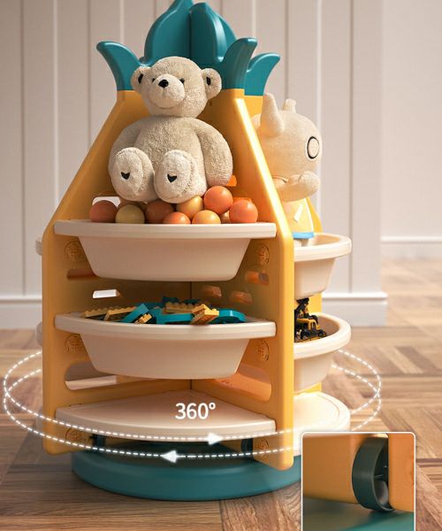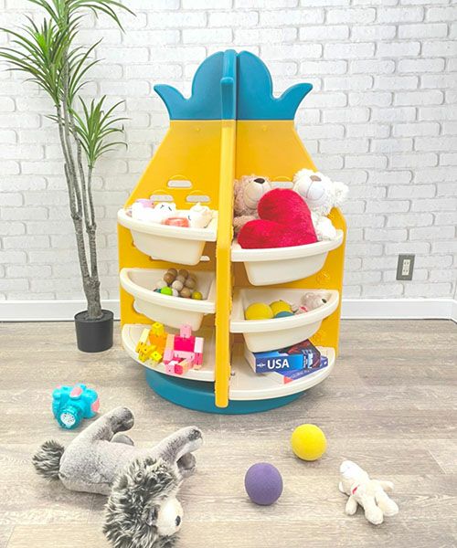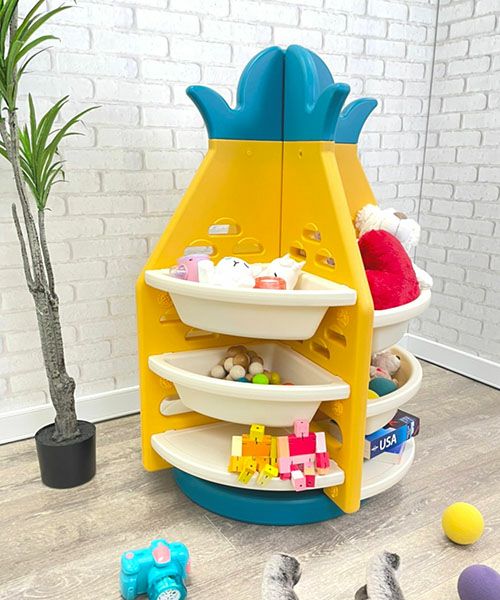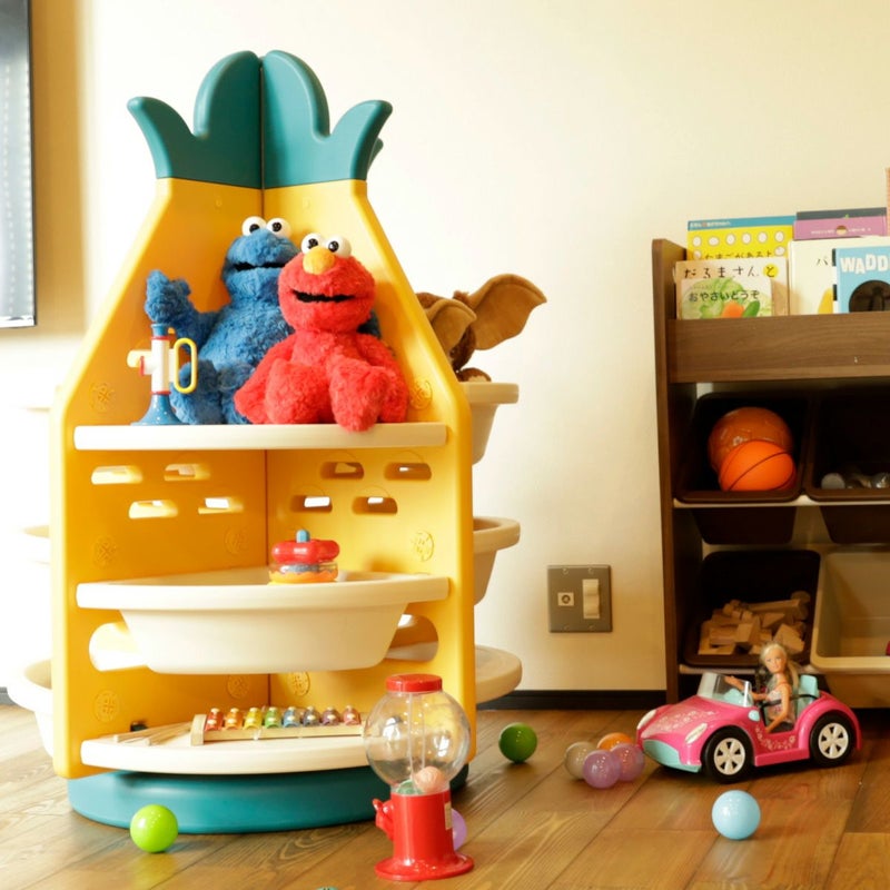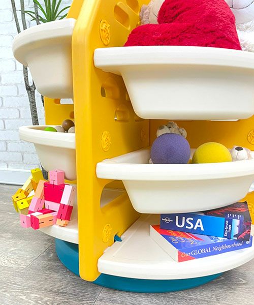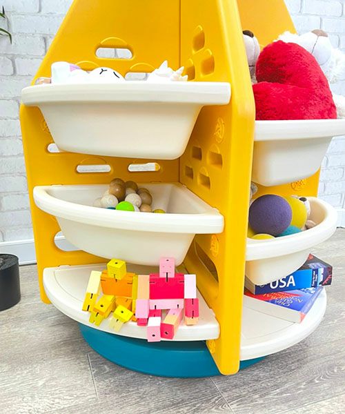 おもちゃがたくさん詰まったラックを回して楽しくお片付け♪