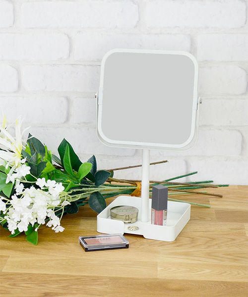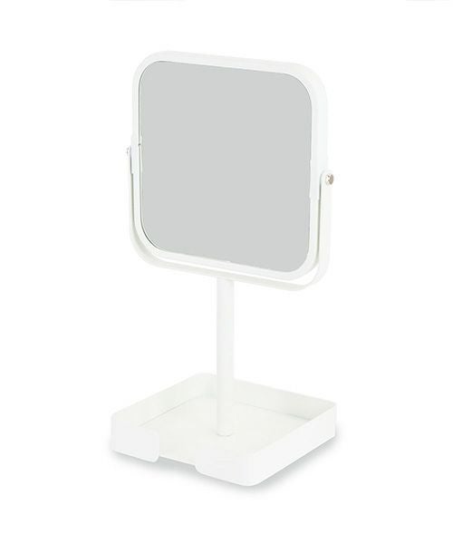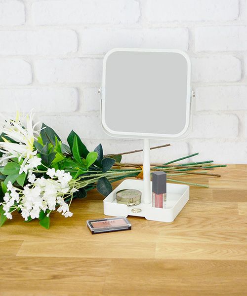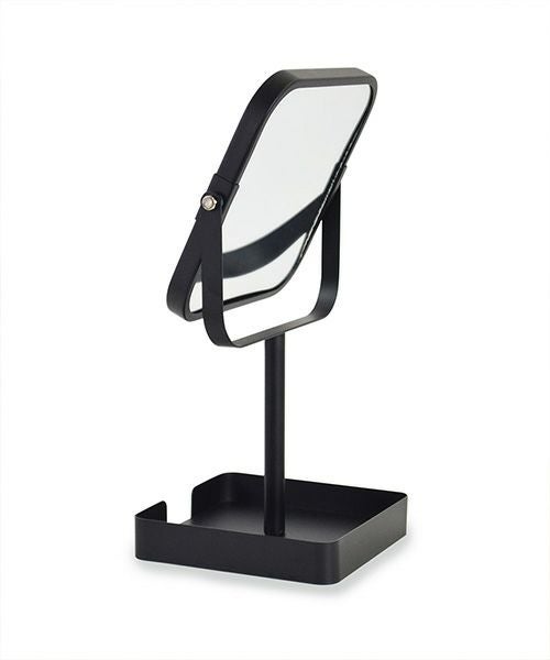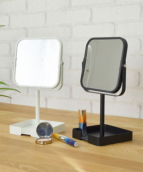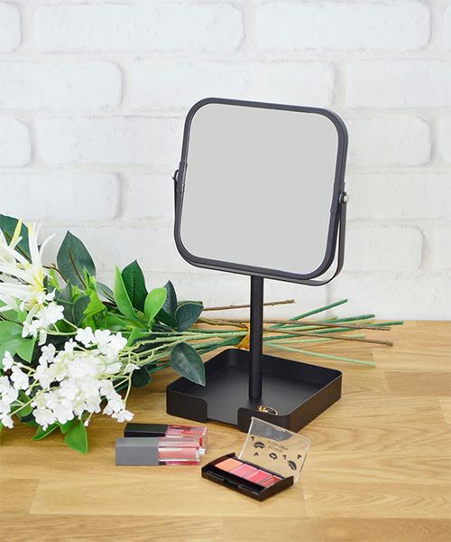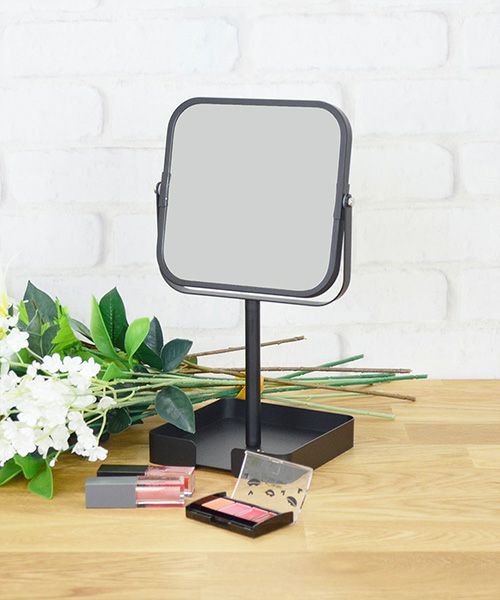 マットな質感のフレームミラー。 自立式なので、パウダールームやベッドサイド、リビング、玄関などに置いて、身だしなみのチェックやヘアメイクなど、幅広くお使いいただけます。 下の台座にコスメやアクセサリー小物を置けます。 等倍・2倍の両面ミラーです。組み立て式。