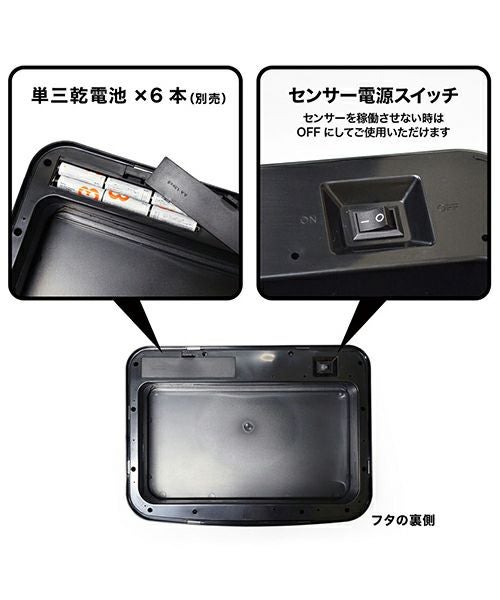 センサー付きステンレスダストボックス。 指紋がつきにくい表面コーティングをしており、汚れたら拭くだけの簡単なお手入れが可能! 手をかざすと蓋が開き、5秒間のカウントダウン後、自動で蓋が閉まります。 もちろんOPEN、CLOSE ボタンを押しても蓋の開閉が可能です。 単三乾電池×6本(別売) *こちらの商品はラッピング対応不可となります。予めご了承ください。 ※ペダル式の【ステンレスダストボックス 11.5L】はこちら