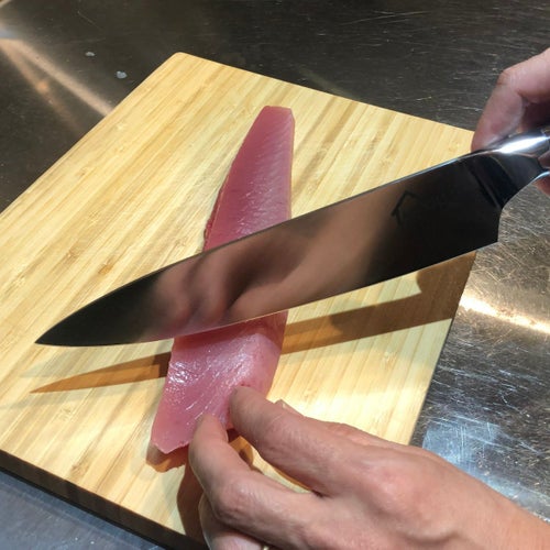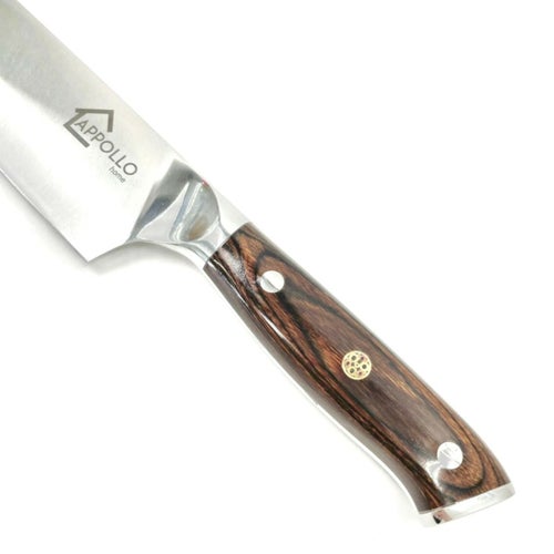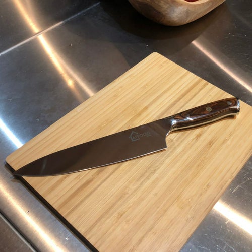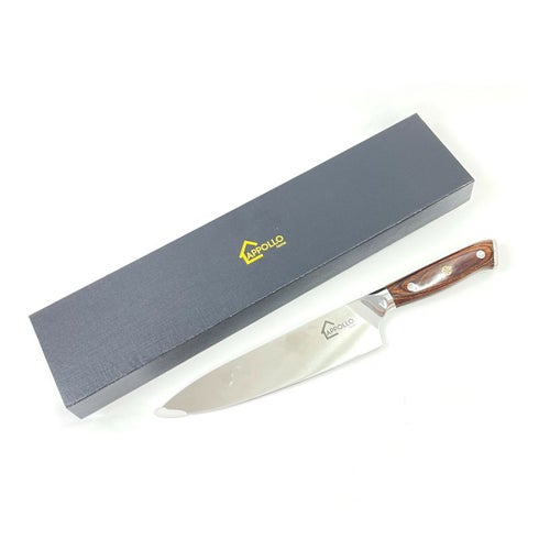 箱入りの高貴なシェフナイフ。お肉の塊など大きな食材もすんなり切れます。 ウッド素材のハンドルで艶やかなコーティングがされています。 ベルベット素材の箱だからギフトとしてもおすすめ♪
