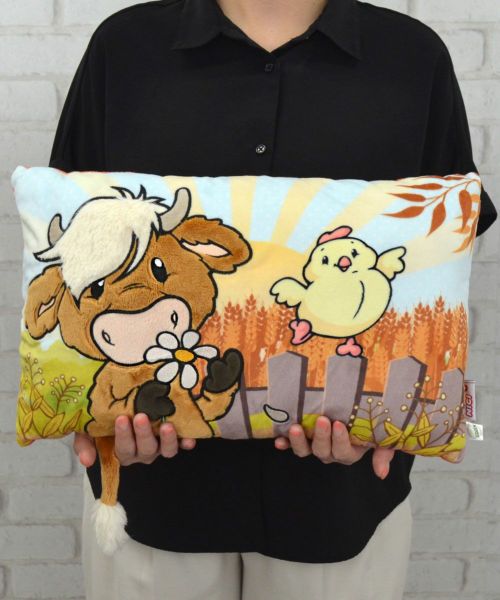 こちらは、ぬいぐるみの肌触りをそのまま残した、ウシ&ヒヨコの43cm×25cmのクッションです。