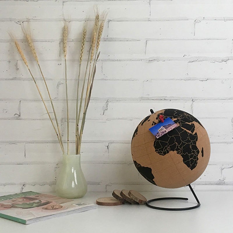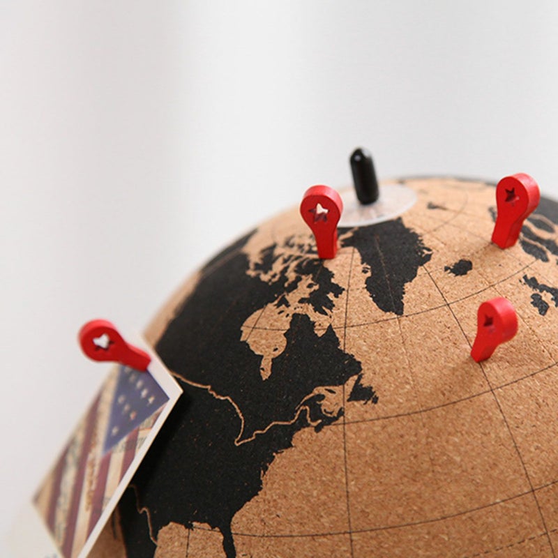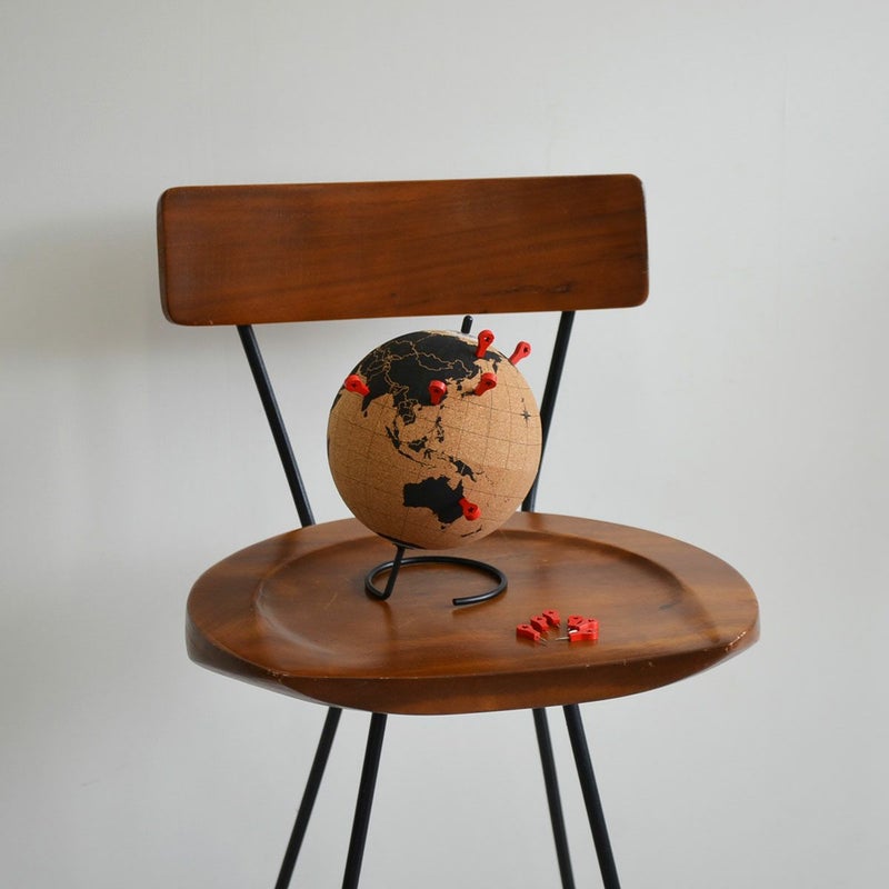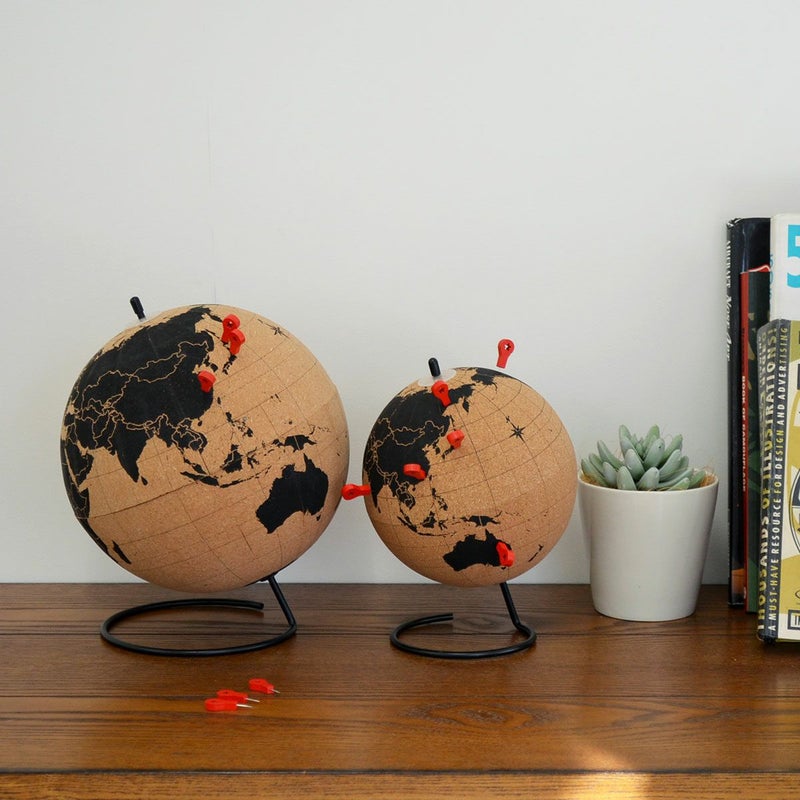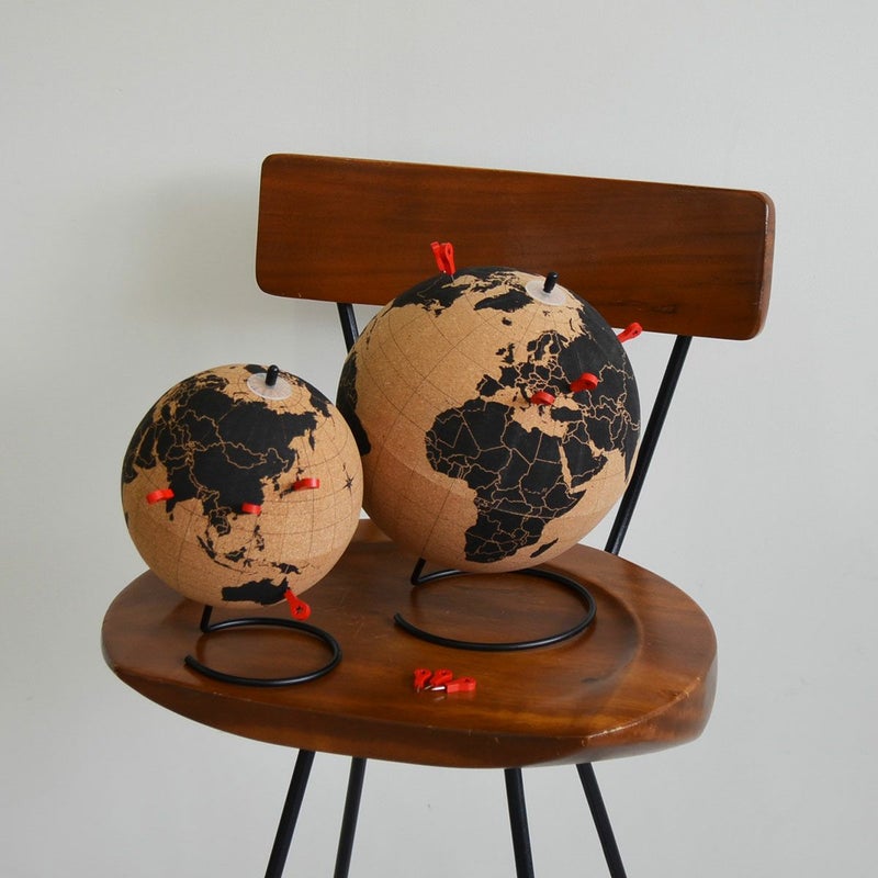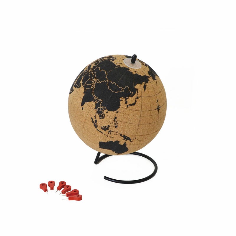 コルク製の回転地球儀。付属のプッシュピン10本でマークできたり、メモをつけたりすることができます。